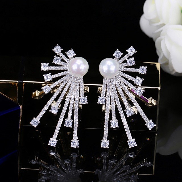 Cercei de mireasa placati aur alb 18K Decorati cu Cristale si Perle Swarovski Dimensiuni cercei: 3.6 cm x 1.8 cm Incuietoare: tip surub Culoare perle: Cream Pearl Culoare cristale: Alb-transparent Greutate: 4.7 grame / fiecare Produsul va fi livrat in cutie de bijuterii oferita GRATUIT si va fi insotit de CERTIFICAT DE GARANTIE.