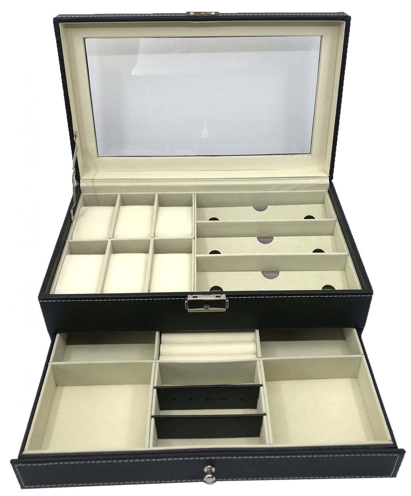 Cutia de bijuterii Night Vision, este ideala pentru doamnele perfectioniste, care doresc organizarea perfecta a bijuteriilor, ceasurilor si ochelarilor de soare, pe care le detin. Avand o culoare neagra intensa, cutia are un design clasic, elegant. Caracteristici: Material : Piele ecologica neagra Dimensiuni: 34 x 21 x 15 cm Personalizarea Cadoului: poate fi facuta cu placuta argintie, gravata cu laserul, cu mesajul dorit. &