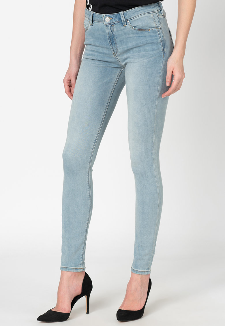 Caracteristici Culoare: albastru pastel Model: uni Croiala: skinny Material: bumbac organic – denim Stil: casual Talie: medie Lungime: lungi Buzunare: 5 modele Detalii: material elastic Inchidere: fermoar si nasture Compozitie Exterior: 86% bumbac – 13% poliester – 1% elastan Info model Modelul poarta un produs marimea W27-L32. Dimensiuni model: 180 cm inaltime – 86 cm bust – 65 cm talie – 94 cm; sold