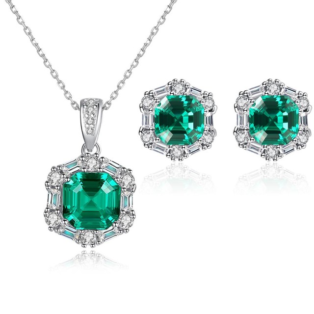 Stil Office | Petrecere | Evenimente speciale | Cadou Design Bijuterii elegante | Bijuterii smarald Tip bijuterie Set cercei si colier argint Metal Argint 925, rodiat Cristale | Pietre Smarald, grad claritate VVS (0.7 cm x 0.7 cm) si Cristale Pure Brilliance Zirconia Culoare pietre Green Emerald (verde smarald) si Crystal Clear (alb transparent) Dimensiuni cercei 1.1 cm x 1.1 cm Dimensiuni pandantiv